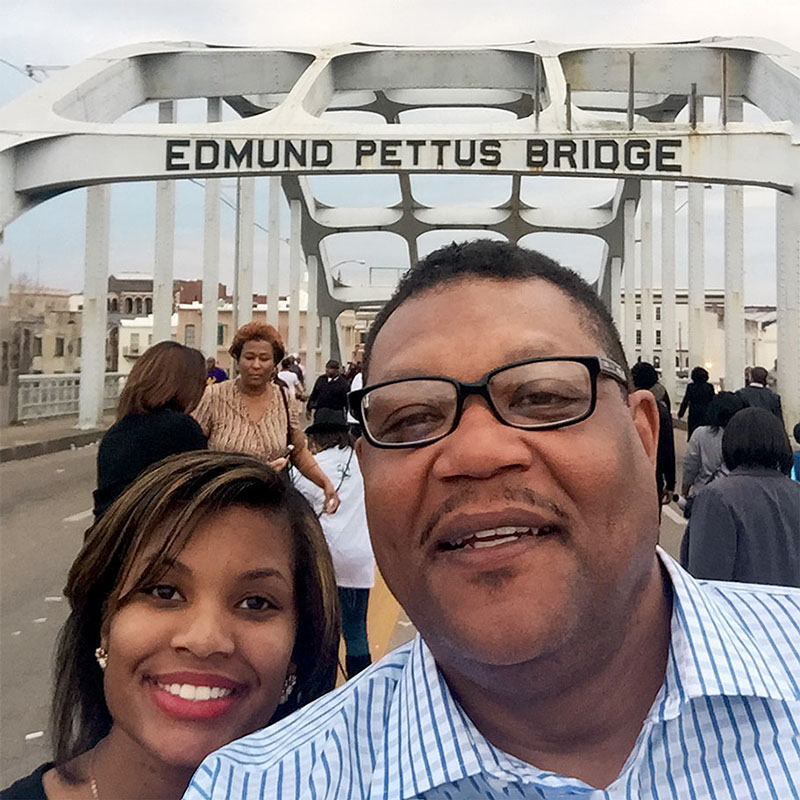 Andrea Dobynes and her dad, Pastor Aaron L. Dobynes, Sr., on the historic Edmund Pettus Bridge in Selma during the 50th anniversary commemorations there. Although Pastor Dobynes was only two when the 1965 marches occurred, both his father and his uncle were among the marchers.
