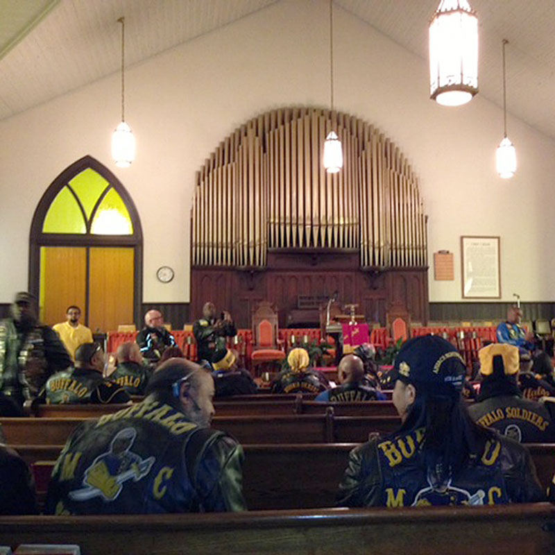 Members of the Buffalo Soldiers motorcycle group visit one of Selma's historic churches during their trip to Alabama for the 50th anniversary of important civil rights marches there.