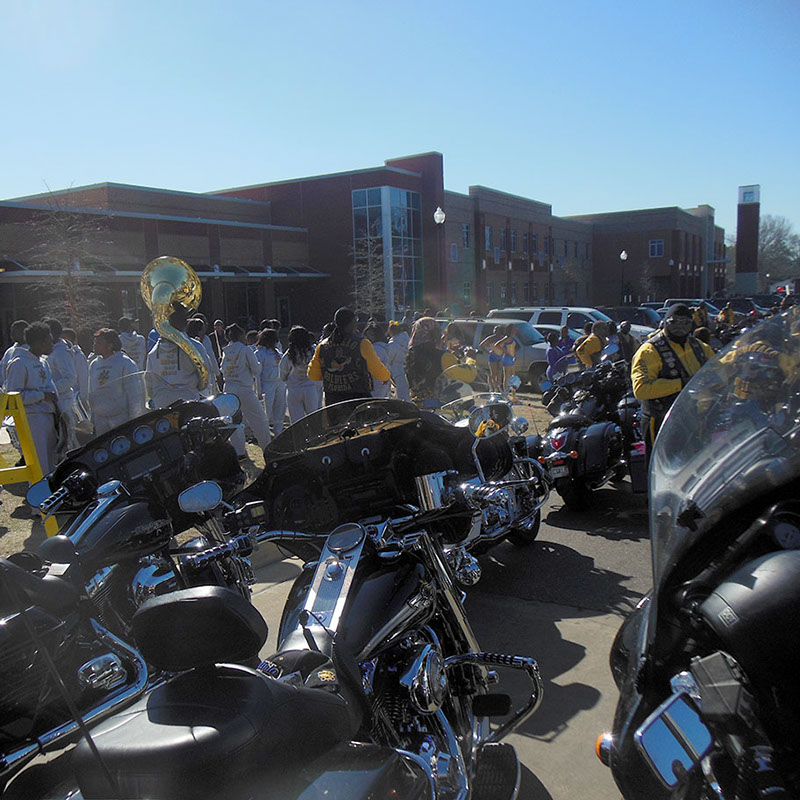 Members of the Buffalo Soldiers motorcycle group, a marching band, and others prepare for the commemorative march and parade in Selma. Several of our members were in attendance.
