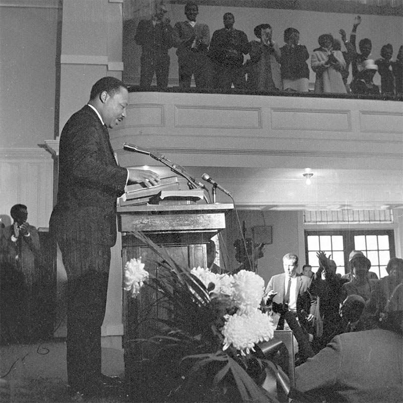 In this photo from 1965, Rev. Martin Luther King prepares to speak in Selma's Tabernacle Baptist Church. Our Pastor Aaron L. Dobynes, Sr., served as pastor of this historic church earlier in his career.