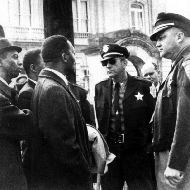 Pastor L. L. Anderson of Selma's Tabernacle Baptist Church speaks with Sheriff Jim Clark in 1965. Although the multiple marches in Selma were costly in terms of human lives, they helped bring about passage of the 1965 Voting Rights Act.